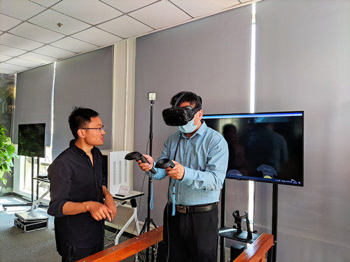 在该公司总经理王华和市场总监谢亚雄的陪同下,彭国平一行参观了该公司红色展厅,全面了解VR党史学习教育、思政课VR实践教学基地及新时代马克思主义学院思政课实践教育一体化建设等领域的应用。通过场景再现、近距离观察及亲身体验,沉浸式感受了AR、VR信息化技术课程及多平台不同技术的VR交互系统,直观地感受到VR技术在思政实践教育的应用。