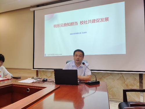 向全体参会人员作以“明形势知担当,校社共建新发展”为主题的微党课分享