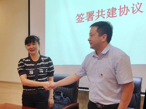 百瑞景社区党委书记王涯玲同志与武汉城市职业学院马克思主义学院形式与政策课教研室党支部书记段浩伟同志握手合影